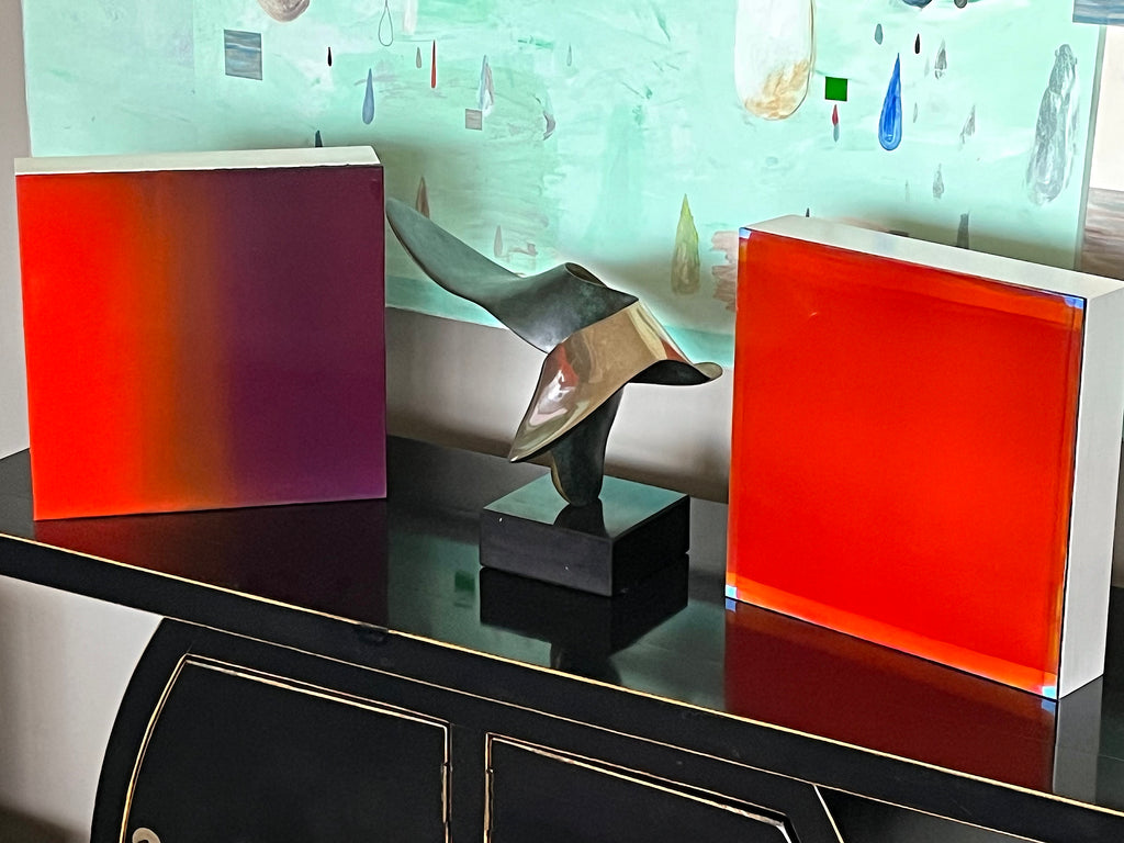 It's hard to photograph these paintings because the colour is so fabulously intense. So I propped the two 12 x 12 inch paintings together on a table in the office to show them in a different setting. See image below.